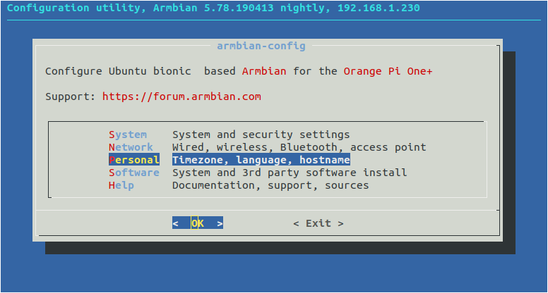 В Armbian Linux имеется утилита командной строки armbian-config, с помощью которой можно выполнить большинство первоначальных настроек операционной системы.