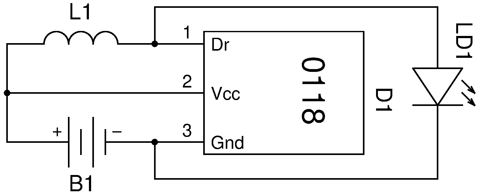 Схема фонарика состоит из микросхемы преобразователя напряжения 0118, дросселя и трёх светодиодов включённых параллельно.