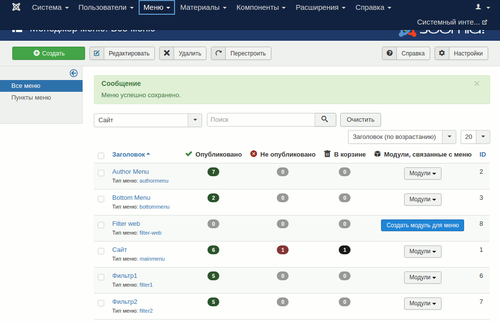 Сохраняем пункт меню и, затем не забываем привязать к вновь создаваемым пунктам меню модули, в том числе и модуль нашего меню.
